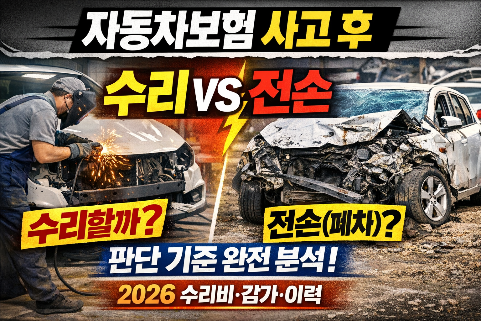 자동차보험 사고 후 수리 vs 전손(폐차) 판단 기준 (2026: 수리비·감가·사고차 이력) 본문